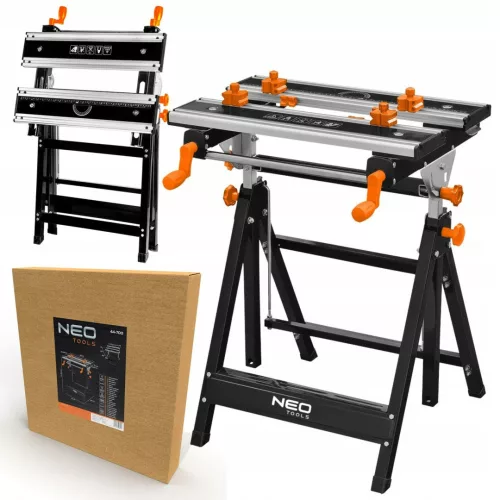 Stół warsztatowy regulowany, aluminiowy 60 x 59 x (77-107) cm 44-700 marki NEO wyposażony w blat w 7-stopniową regulację wysokości 77-107 cm, zmianę szerokości oraz 4-stopniowy kąt jego nachylenia (0°, 25°, 50°, 80°). Wykonany ze stali z profilami aluminiowymi i wykończony powloką proszkową. Wzmocniony przez metalowe śruby prowadzące ruchomą część blatu. Rękojeść z tworzywa ułatwia odpowiednie ustawienie stołu. Charakteryzuje się kompaktowymi wymiarami po złożeniu (60 x 29 x 77 cm). Posiada maksymalne obciążenie 100 kg. Oferowany jest w zestawie z 4 plastikowymi szczękami zaciskowymi oraz kluczem do skręcania. Polecany do warsztatów dla majsterkowiczów i profesjonalistów.