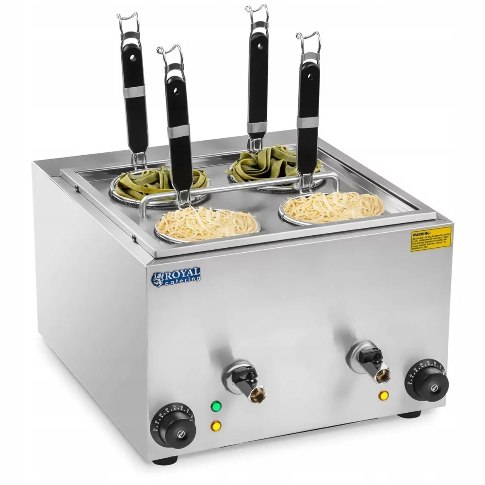 Elektryczny warnik do makaronu od Royal Catering gwarantuje w krótkim czasie przygotowanie świetnego makaronu pod każdą postacią, w wersji al dente lub na miękko. Ugotowanie innych produktów, np. jajek czy warzyw, również stanie się niezwykle proste. Model ma dwie grzałki po 1500 W mocy każda, a precyzję jego pracy gwarantują oddzielne termostaty. Będzie niezastąpiony w restauracjach, barach szybkiej obsługi i cateringu.