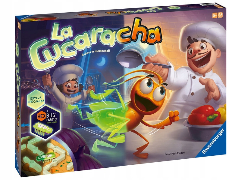 Z okazji 10 urodzin wielokrotnie nagradzanej gry La Cucaracha oddajemy w Wasze ręce jej specjalnąlimitowaną edycję świecącą w ciemności! Wyłącz światła, a karaluch, kości, sztućce i pułapki zaczną świecić, więc możesz bawić się przy włączonym lub wyłączonym świetle! Tylko ci, którzy szybko zakręcą świecącymi w ciemności sztućcami, mogą zwabić karalucha do jednej z czterech kuchennych pułapek. Za każdym razem, gdy karaluch zostanie złapany, zbierz świecący w ciemności chip. Pierwszy gracz z pięcioma żetonami wygrywa upiorne polowanie na świecącego w ciemności elektronicznego karalucha!