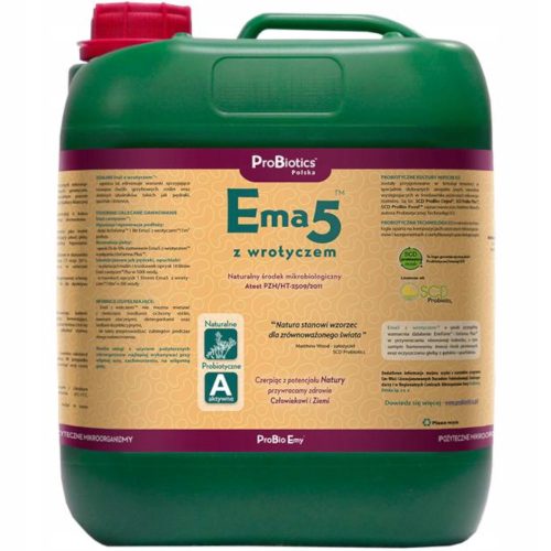 Ema5 z Wrotyczem to ekologiczny preparat ograniczający lub eliminujący warunki sprzyjające rozwojowi patogenów grzybowych roślin, a także niektórych szkodników takich jak pędraki, opuchlaki i drutowce. Produkt wzmacnia działanie EmFarma i EmFarma Plus w przywracaniu zdrowia środowiska, hamowaniu inwazji chorób pleśniowych oraz oczyszczaniu gleby z pędraków i opuchlaków.