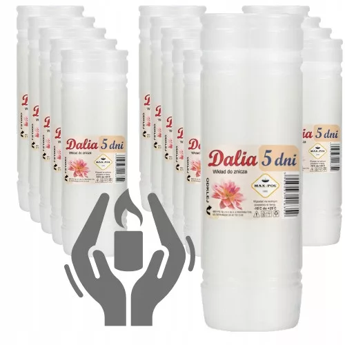 Wkład do znicza / Znicz parafinowy / Wkład parafinowy Model: Dalia 5 Liczba sztuk: 17 Rodzaj: parafinowy Czas świecenia: do 5 dni Wysokość: 18,5 cm Średnica: 6 cm