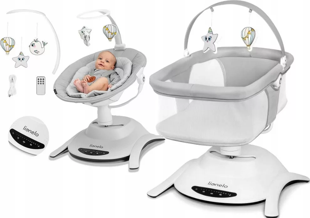 Dzięki cichej pracy silnika, możesz mieć pewność, że nie wybudzi dziecka, kiedy utnie sobie słodką drzemkę. Model ten odtwarza 12 spokojnych melodii oraz pałąk z zabawkami - 3 w funkcji bujaczka, 2 w funkcji łóżeczka.