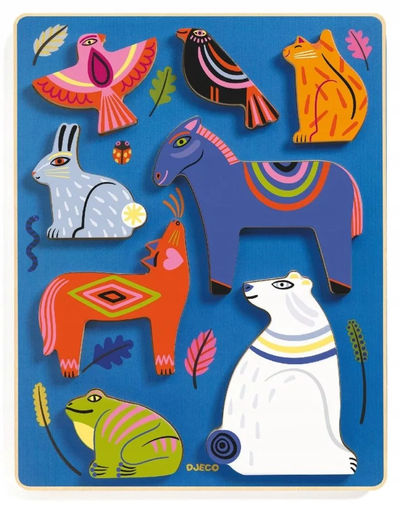 Drewniane puzzle z motywem zwierząt. Poprzez układanie dzieci ćwiczą wyobraźnię, zdolności motoryczne, koordynację wzrokowo-ruchową, logiczne myślenie, a ponadto cieszą się zabawą.