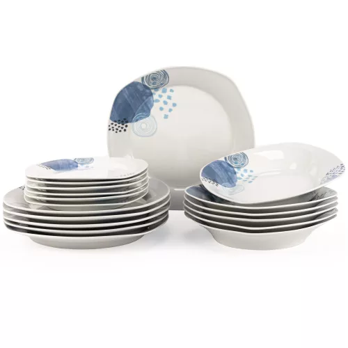 ➡️ Główną cechą tego zestawu obiadowego jest jego wykonanie z najwyższej jakości porcelany, co gwarantuje trwałość, wytrzymałość oraz odporność na uszkodzenia. Wzorek nieregularnych kształtów, który ozdabia każdy z talerzy, nadaje zestawowi niepowtarzalny i wyrafinowany wygląd, co sprawia, że prezentuje się pięknie zarówno na co dzień, jak i podczas uroczystych okazji.