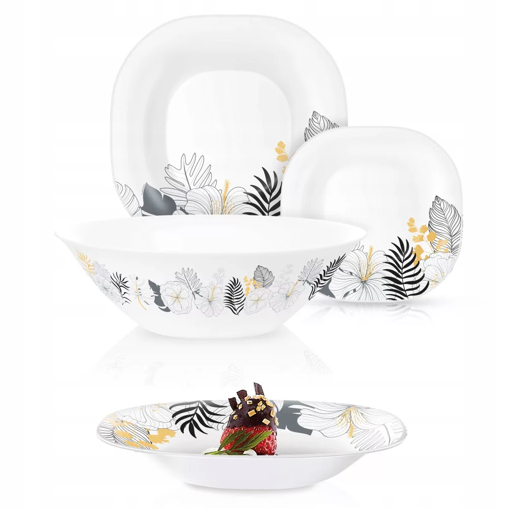 Zestaw obiadowy białyNiezwykle wytrzymały i estetyczny. Wykonany ze szkła hartowanego. Jest to doskonała propozycja dla tych, którzy cenią sobie połączenie funkcjonalności i współczesnego designu. Dzięki specjalnej obróbce termicznej, każde naczynie z tego zestawu obiadowego dla 6 osób wykazuje zwiększoną odporność na uderzenia i zarysowania, co czyni je idealnym wyborem na codzienne obiady, jak i eleganckie przyjęcia. Szkło, jako materiał nieporowaty, gwarantuje najwyższy poziom higieny i łatwość w utrzymaniu czystości, co jest nieocenione w każdym gospodarstwie domowym.Praktyczność i stylSerwis obiadowy z dużą salaterką jest nie tylko przyjemny dla oka, ale również niezwykle praktyczny. Naczynia bez problemu można myć w zmywarce i używać w kuchence mikrofalowej, co oszczędza czas i energię w szybkim tempie życia. Subtelne zdobienia czarno-złote nadają unikalnego charakteru, który zachwyci każdego użytkownika i gościa.
