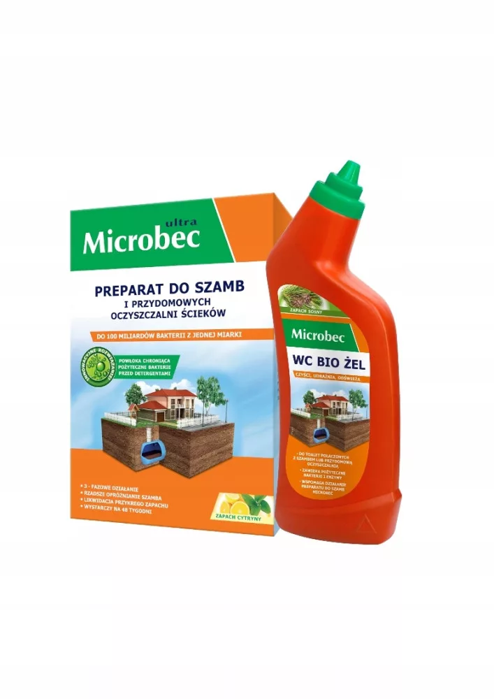 Microbec to preparat do biodegradacji zawartości szamba. Systematyczne stosowanie Microbec'u zmniejsza częstotliwość opróżniania szamba, usuwa nieprzyjemny zapach i udrażnia system instalacji sanitarnej. Musująca formuła o świeżym zapachu cytryny ułatwia rozrzedzanie się preparatu w zbiorniku.Wystarczy wsypać odpowiednią ilość do toalety i spłukać.