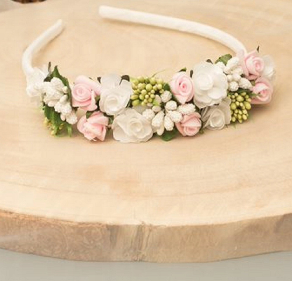 Lekka i wygodnaopaska do włosów , ręcznie ozdobiona lśniącymi akcentami oraz pięknymi kwiatami zachwyci przy wielu okazjach. Idealnie pasuje na Biały Tydzień.