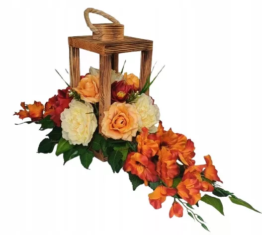 Wiązanka nagrobna wykonana ręcznie z wysokiej jakości sztucznych kwiatów w donicy zalanej betonem.