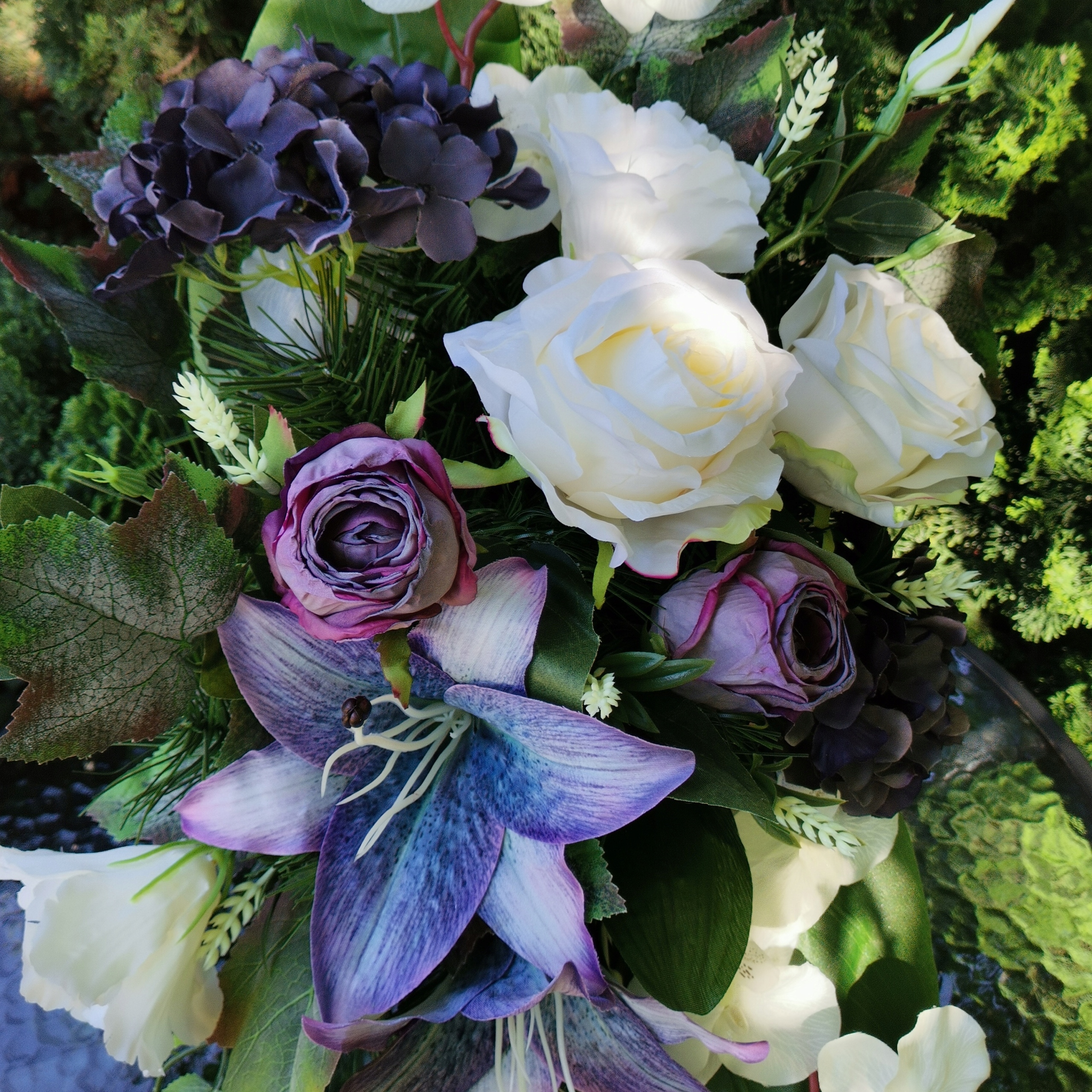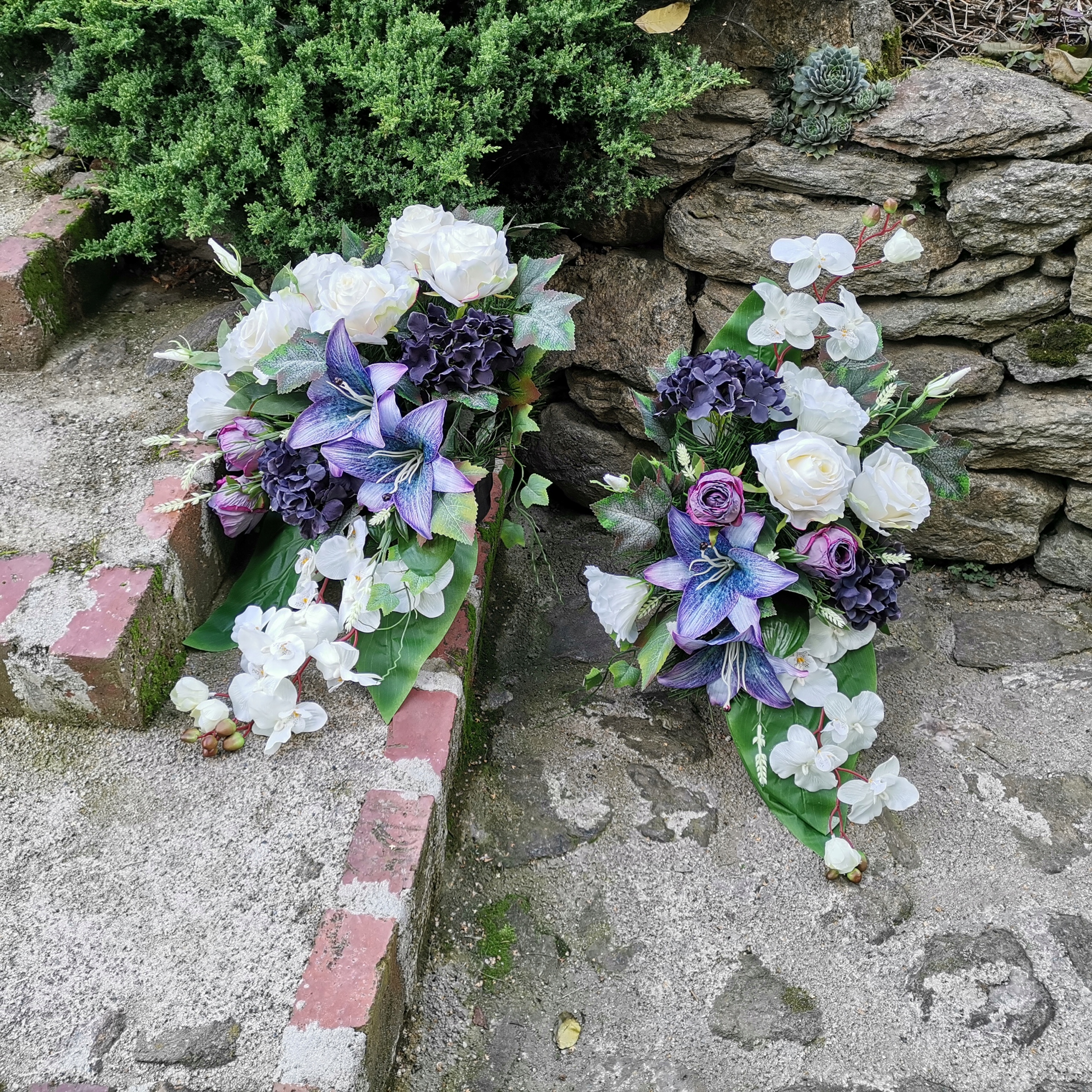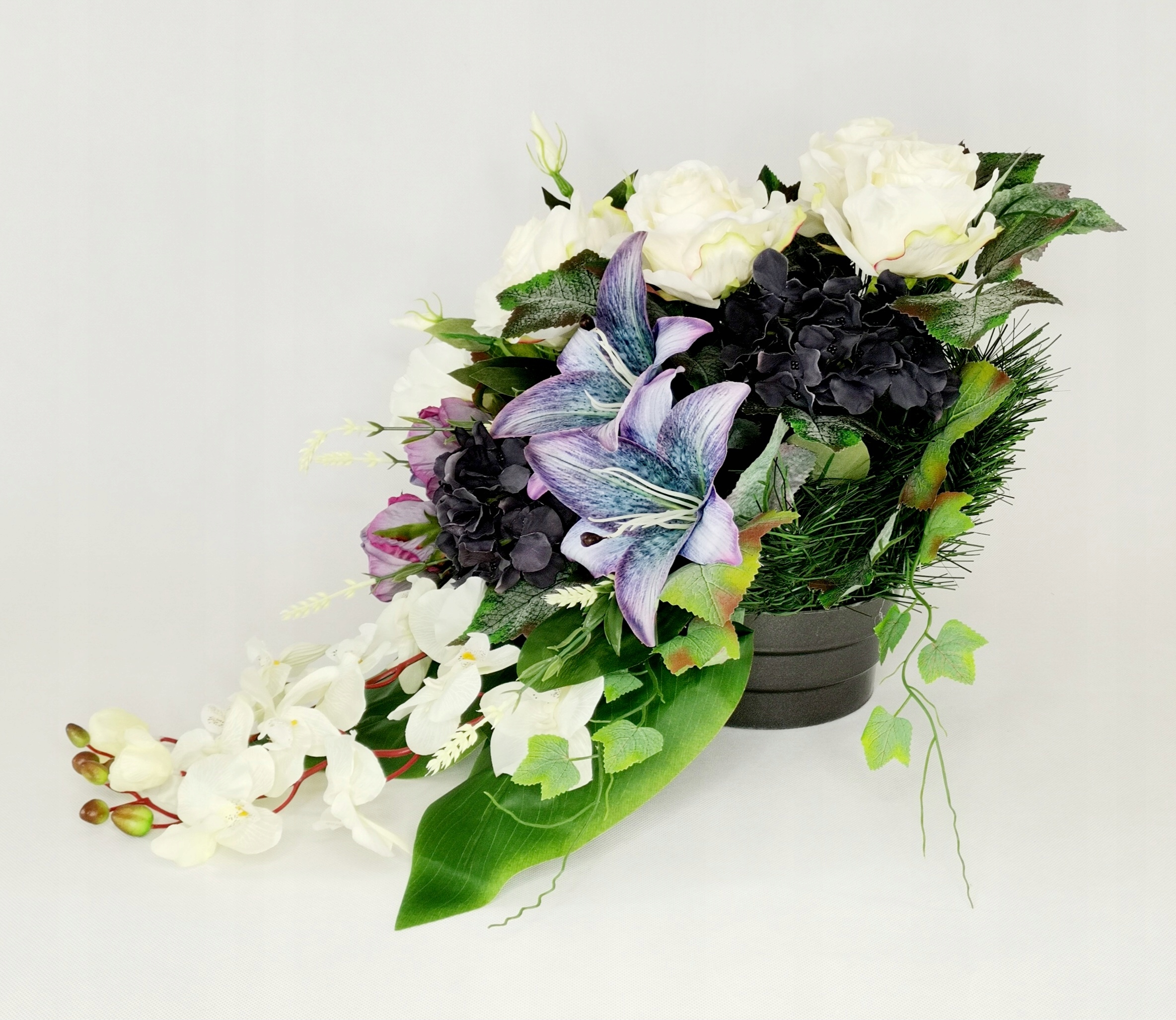 Podstawę stanowi czarna doniczka dodatkowo wypełniona gipsem, dzięki temu stroik jest cięższy i stabilnie stoi na grobie.