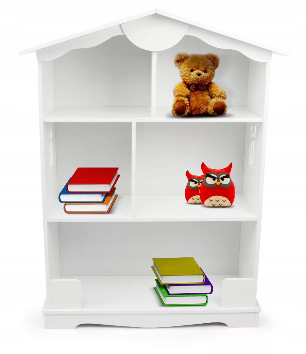 Biały regał w kształcie uroczego domku wykonany z wytrzymałej płyty MDF.