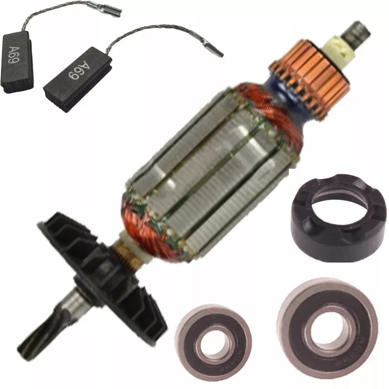 ZESTAW: wirnik (6 zębów), łożysko igiełkowe zębatki, 2szt. łożysk, gumowy amortyzator małego łożyska, 2szt. szczotek węglowych z bezpiecznikami