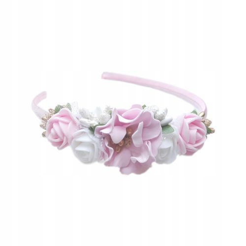 Opaska asymetryczna z różyczkami i kwiatuszkiem w kolorze pudrowego różu i bieli ze złotymi i białymi dodatkami. Umieszczona na plastikowej bazie w kolorze różu. Opaska jest uniwersalna, będzie pasować zarówno na 3 latke jak i dorosła kobiete.