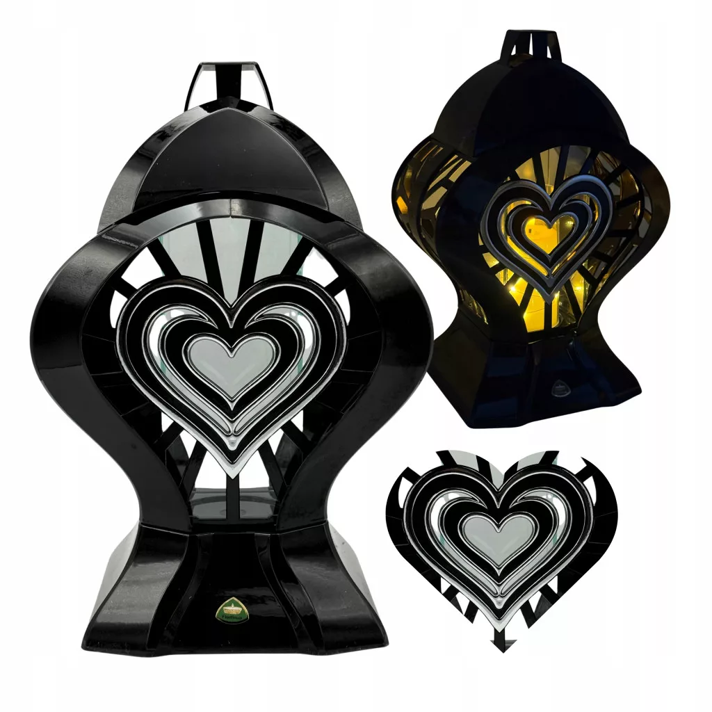 Podstawka oraz kapturek wykonany z plastiku w kolorze czarnym. Ażurowe elementy ozdobne wykonane z tworzywa sztucznego. Szklane ściany boczne, przednia i tylna.