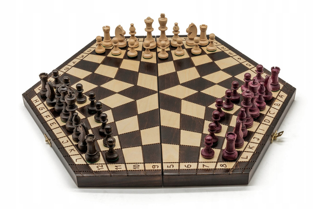 Komplet stanowi kaseta z planszą szachową, zestaw figur szachowych w kolorach białym, brązowym i wiśniowym po 16 elementów w każdym oraz wielojęzyczna instrukcja.