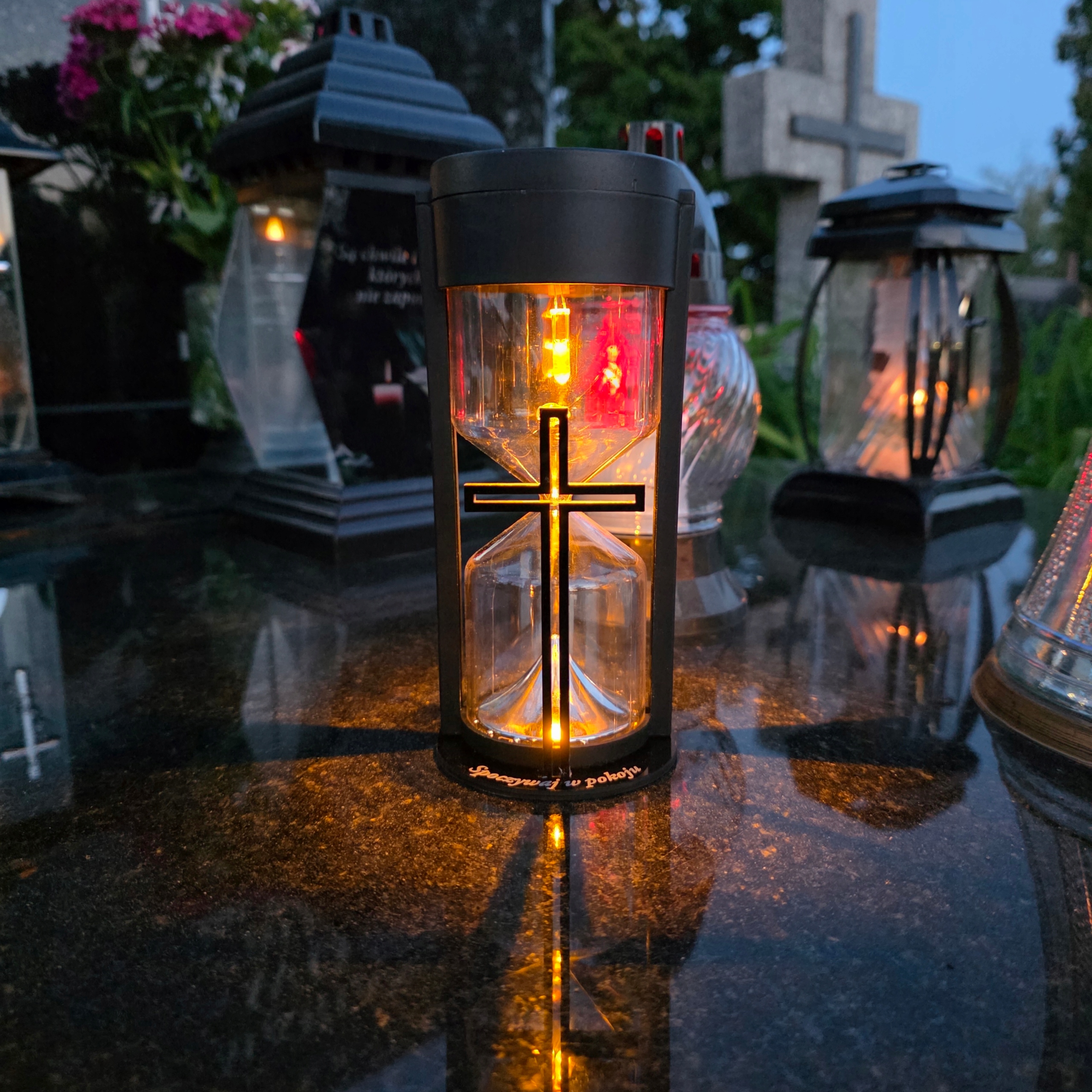 LAMPA SOLARNA ZNICZ NA GRÓB NOWOCZESNA INSPIROWANA KLASYKĄ ZE ZŁOTYM KRZYŻEM