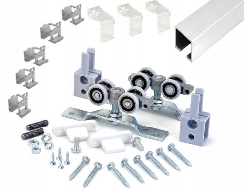 W tym wariancie mają Państwo komplet okuć, szynę, mocowania do szyny, wkręty do montażu oraz mocowania do maskownicy drewnianej