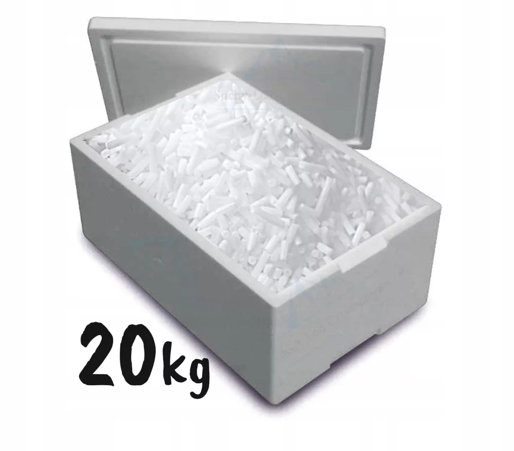 W skład zestawu wchodzi 20kg suchego lodu 16mm zapakowany w worek, styrobox (pojemnik do transportu suchego lodu, grubość ścianki 4cm) zapakowany w karton.