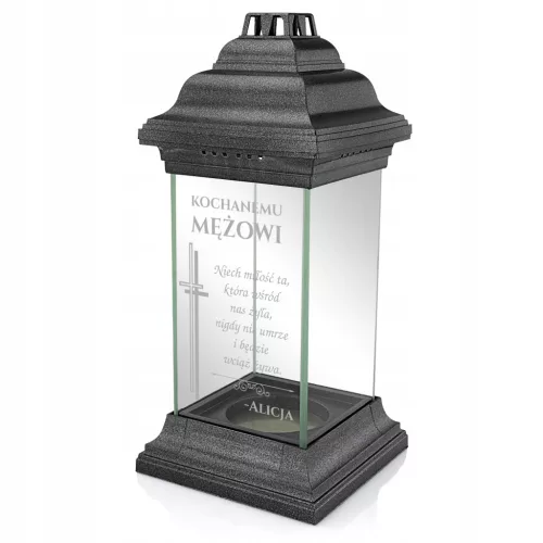 Znicz wykonany został z transparentnego szkła, podstawa z tworzywa sztucznego. Przystosowany do różnych rozmiarów wkładów, ze stabilną podstawą i daszkiem zabezpieczającym przed wiatrem.