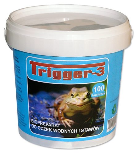 Trigger-3 jest biopreparatem zawierającym wszystkie mikroorganizmy, enzymy i aktywatory biologiczne niezbędne do realizacji prawidłowego, pełnego obiegu materii w stawie. Jest szczepionką. Nie wprowadza do stawu metali ciężkich, ani innych substancji szkodliwych. Produkt jest bezpieczny dla ryb, płazów, ludzi, roślin wodnych , ptaków, psów i kotów często pijących wodę z oczek Zawiera testy stadium eutrofizacji stawu z instrukcją.