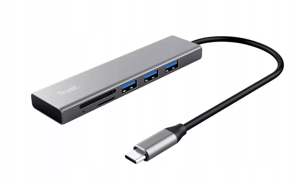 Kompaktowy, aluminiowy 3-portowy hub USB z czytnikiem kart (micro) SD i złączem USB-C.