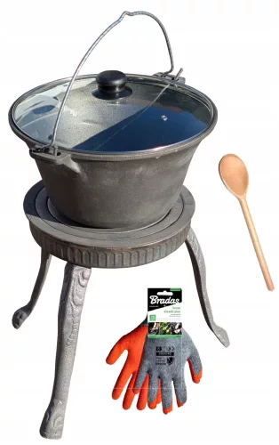 KOCIOŁEK ŻELIWNY WĘGIERSKI 8L WRAZ Z FAJERKAMI I PODSTAWĄ. RAZEM KOCIOŁEK Z POKRYWĄ OSIĄGA POJEMNOŚĆ 8 LITRÓW.