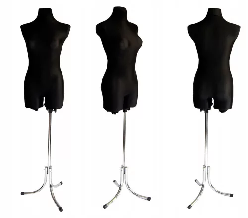 Дамски шивашки манекен в най-популярния размер 36/38 с бедра , черна тениска и прав метален крачол . Манекенът се използва за показване на всякакъв вид облекло. Благодарение на своята структура ( издължен ханш ) е идеален за представяне на: блузи, пуловери, ризи, тениски, рокли, рокли.