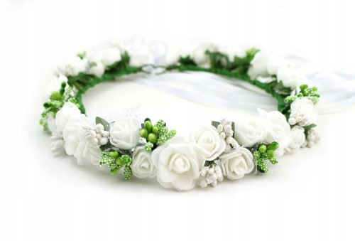 Wianek komunijny w odcieniach bieli i zieleni. Wykonany ręcznie, z piankowych kwiatów doskonale imitujących kwiaty żywe. Regulowany satynowymi wstążeczkami, obwód 50cm.