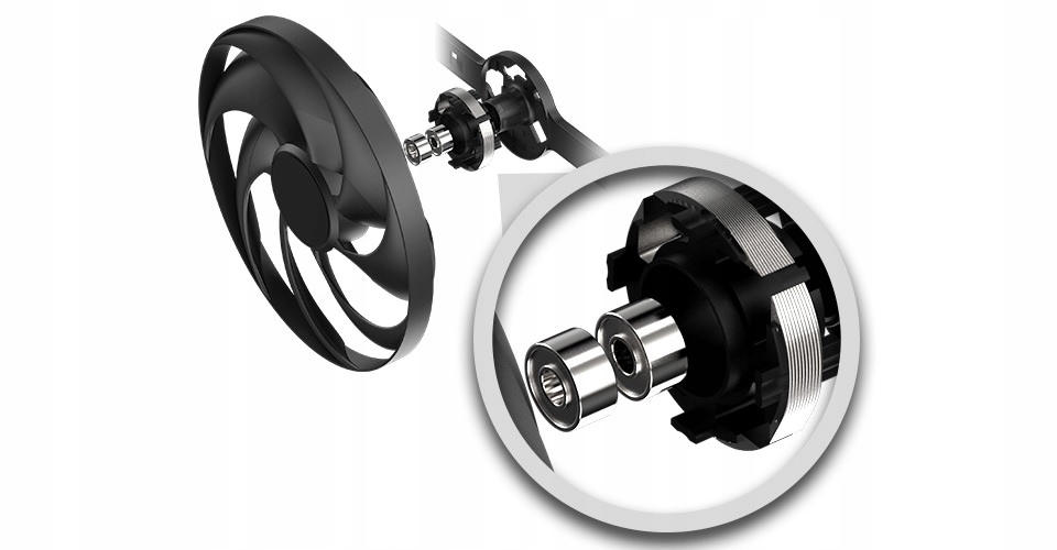 Te wentylatory mają podwójne łożyska kulkowe, które w naszych testach mają żywotność o około 85% dłuższą niż łożyska ślizgowe. Ulepszenia łopatek wentylatora oznaczają, że rozwiązanie jest do 10% cichsze niż poprzednia generacja.