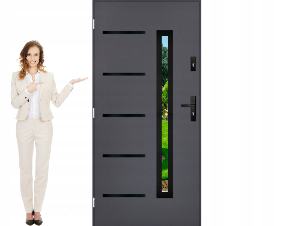 Drzwi wypełnienie są grafitowym polistyrenem spienionym. Istnieje możliwość wypełnienia ich pianą poliuretanową ( za dopłatą ) oraz dodatkowo dokupienia ciepłego pakietu, w skład którego wchodzi: ościeżnica i próg z przekładka termiczną oraz 3 zawiasy 3D. ( możliwość regulacji w 3 płaszczyznach )