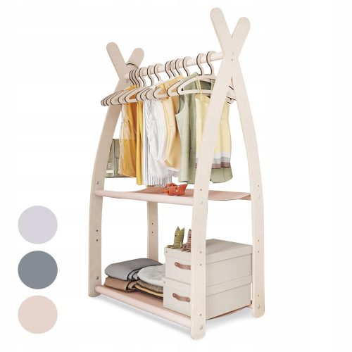 Wieszak dla dzieci dedykowany jest do przechowywania części garderoby. Idealnie nadaje się do segregowania i układania. Stojak może być zamontowany w każdym pomieszczeniu – pokoju dziecięcym, garderobie, sypialni lub przedpokoju. Produkt wykonany jest z wytrzymałego materiału, mocnej sklejki oraz drążków z naturalnego drewna. Gwarantuje to solidność i stabilność konstrukcji.