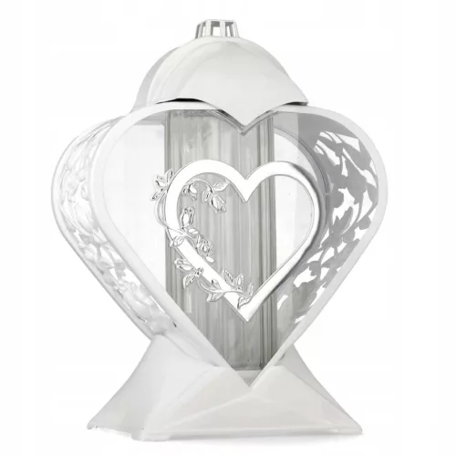 Na przednim szklanym panelu znajduje się srebrna aplikacja w kształcie serca, udekorowana motywem kwiatowym. Ten chłodny, metaliczny akcent kolorystyczny harmonijnie współgra z bielą podstawy, kapturka i ażurowych zdobień, nadając kompozycji elegancki i czysty wygląd. Solidna, geometryczna podstawa zapewnia stabilność, a dopasowany kapturek chroni płomień przed wpływem pogody.