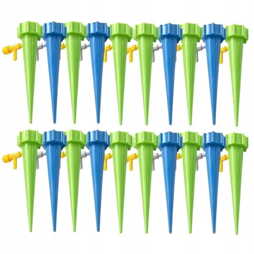 Zestaw zawiera 20 nawadniaczy w kolorach zielonym lub niebieskim, które mogą być łatwo i bezpiecznie przymocowane do większości standardowych butelek PET.