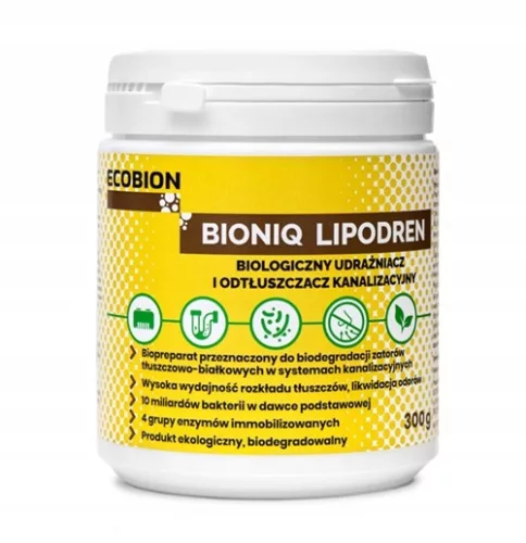 BioniQ LipoDren firmy Ecobion to specjalistyczny preparat biotechnologiczny, przeznaczony do udrażniania rur kanalizacyjnych z zatorów organicznych wywołanych m.in. odkładającym się tłuszczem.