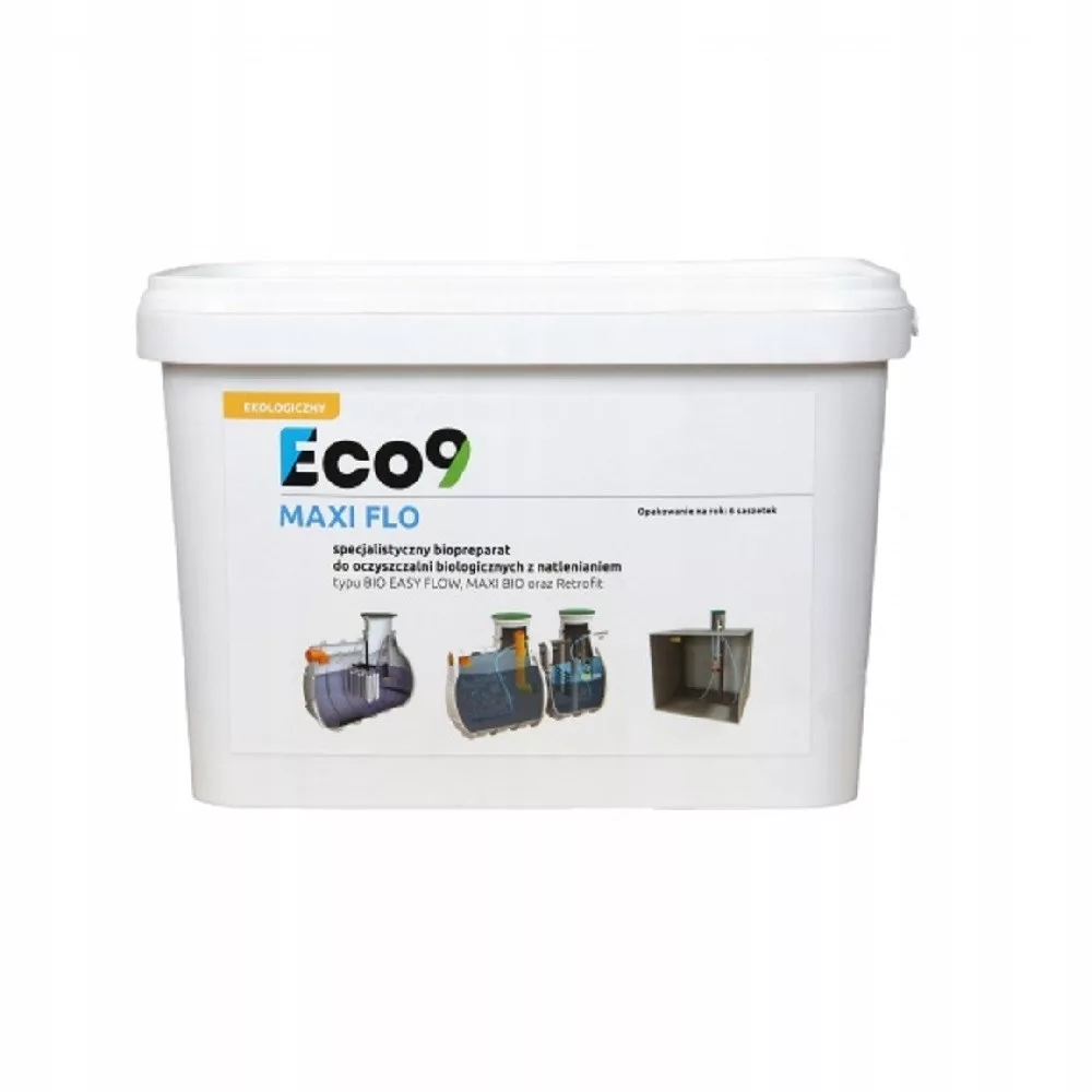 Eco9 MAXI FLO to specjalistyczny preparat stosowany do przydomowych oczyszczalni biologicznych z napowietrzaniem drobnopęcherzykowym oraz osadników z zamontowanym systemem BioFix. Odpowiednie stosowanie Eco9 MAXI FLO poprawia jakość oczyszczania ścieków, dzięki czemu prowadzi do redukcji nieprzyjemnych zapachów.