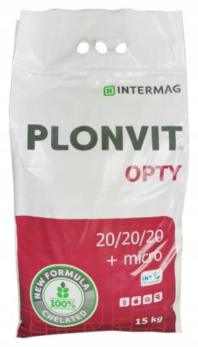PLONVIT OPTY to krystaliczny, rozpuszczalny w wodzie nawóz NPK (20/20/20) z mikroelementami przeznaczony do dolistnego stosowania. Może być także wykorzystywany do sporządzania pożywki przeznaczonej do fertygacji upraw w gruncie.