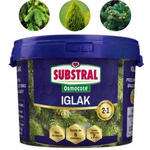 Nowość! Substral Osmocote 2w1 Iglak to szybko i długo działający nawóz przeznaczony do roślin kwaśnolubnych takich jak iglaki, rododendrony i azalie. Przeciwdziała brązowieniu igieł. Widoczne efekty w ciągu 7 dni! Extra długie działanie do 6 miesięcy!