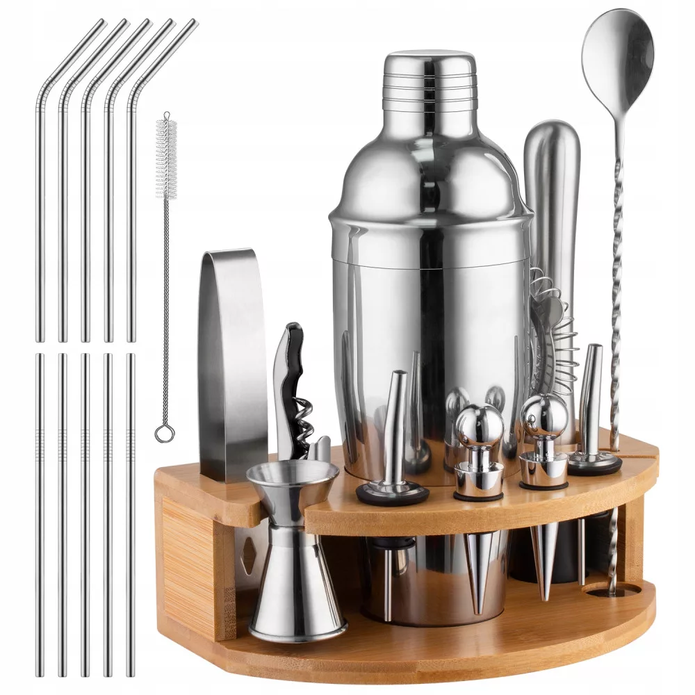 Na sprzedaż mam Zestaw Barmański składający się z 23 elementów. Zestawy barmańskie cieszą się coraz większą popularnością, znacznie ułatwiając przygotowywanie wielu drinków. Już teraz nie będziecie musieli wydawać znaczących kwot na drinki na mieście, będziecie mogli przygotować je całkiem sami. Zestawy barmańskie to również świetny i oryginalny prezent na święta oraz inne okazje. Nasze zestawy wykonane są z wysokiej jakości materiałów, elementy wykonane są ze stali nierdzewnej a sama podstawka jest bambusowa.