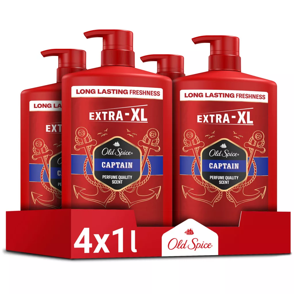 Old Spice Captain Męski płyn do kąpieli, Żel pod prysznic i szampon 3w1, 4x1L Jeszcze więcej dni z długo utrzymującą się świeżością o jakości perfum i wygodna pompka, dzięki której każdy może łatwo używać żelu.