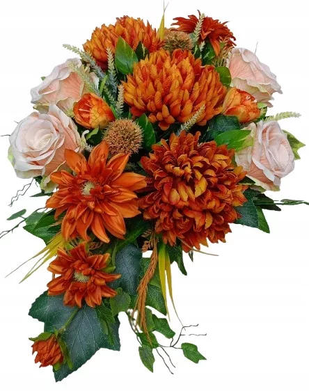 Изключително красива композиция от изкуствени цветя, идеална за поклонение. Включва елементи като хризантеми и рози, наредени върху тежка пластмасова основа, затежена с цимент. Идвайки с размери приблизително 30 см височина, 63 см дължина и 35 см ширина, този строик добавя величественост и уважение към всяка гробна площ. Цветовете могат да варират, което дава уникален вид на всяка композиция.