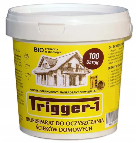 TRIGGER - 1 zawiera enzymy i bakterie rozkładające zanieczyszczenia organiczne w ściekach (odchody, papier, resztki roślinne, tłuszcze) oraz substancje ułatwiające biodegradację środków piorących i myjących. Nie jest kwasem, zasadą, ani inną substancją chemiczną np. chlorującą lub wydzielającą dwutlenek węgla w czasie rozpuszczania się.