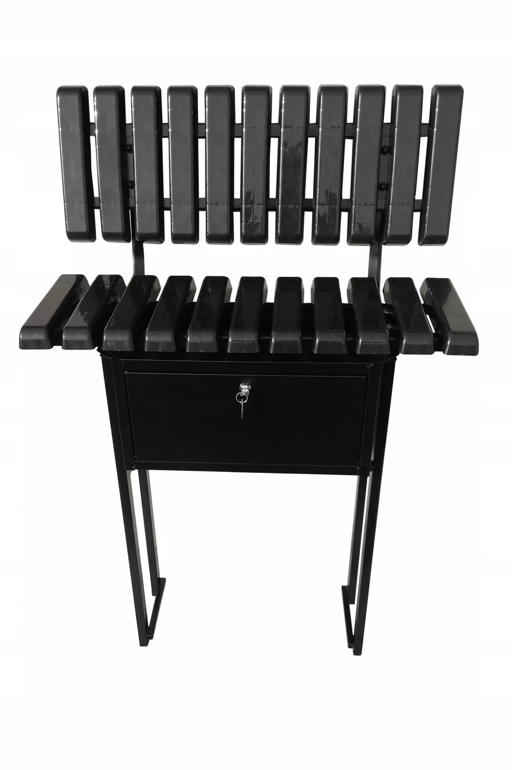 Pod siedziskiem znajduje się skrzynka metalowa bardzo pojemna również malowana proszkowo .Zamykana jest na kluczyk.